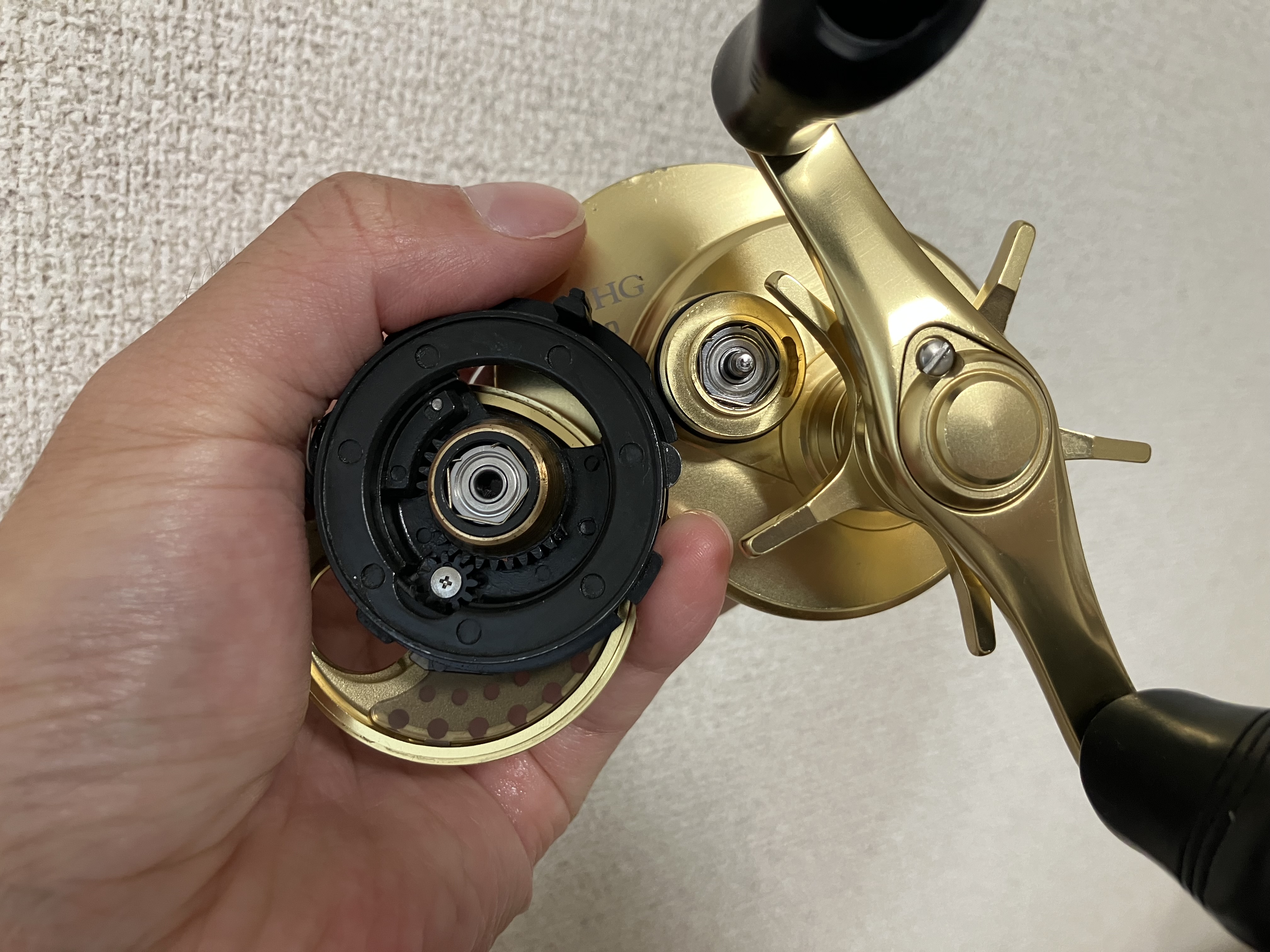 ベイトリールのスプールを支えるベアリングはこのサイズです。ベアリングが死んでいると飛距離に直結するのでベイトリールにおいて非常に重要なベアリングです。ドライバー等の工具無しで交換できるので交換のハードルも低いです。
